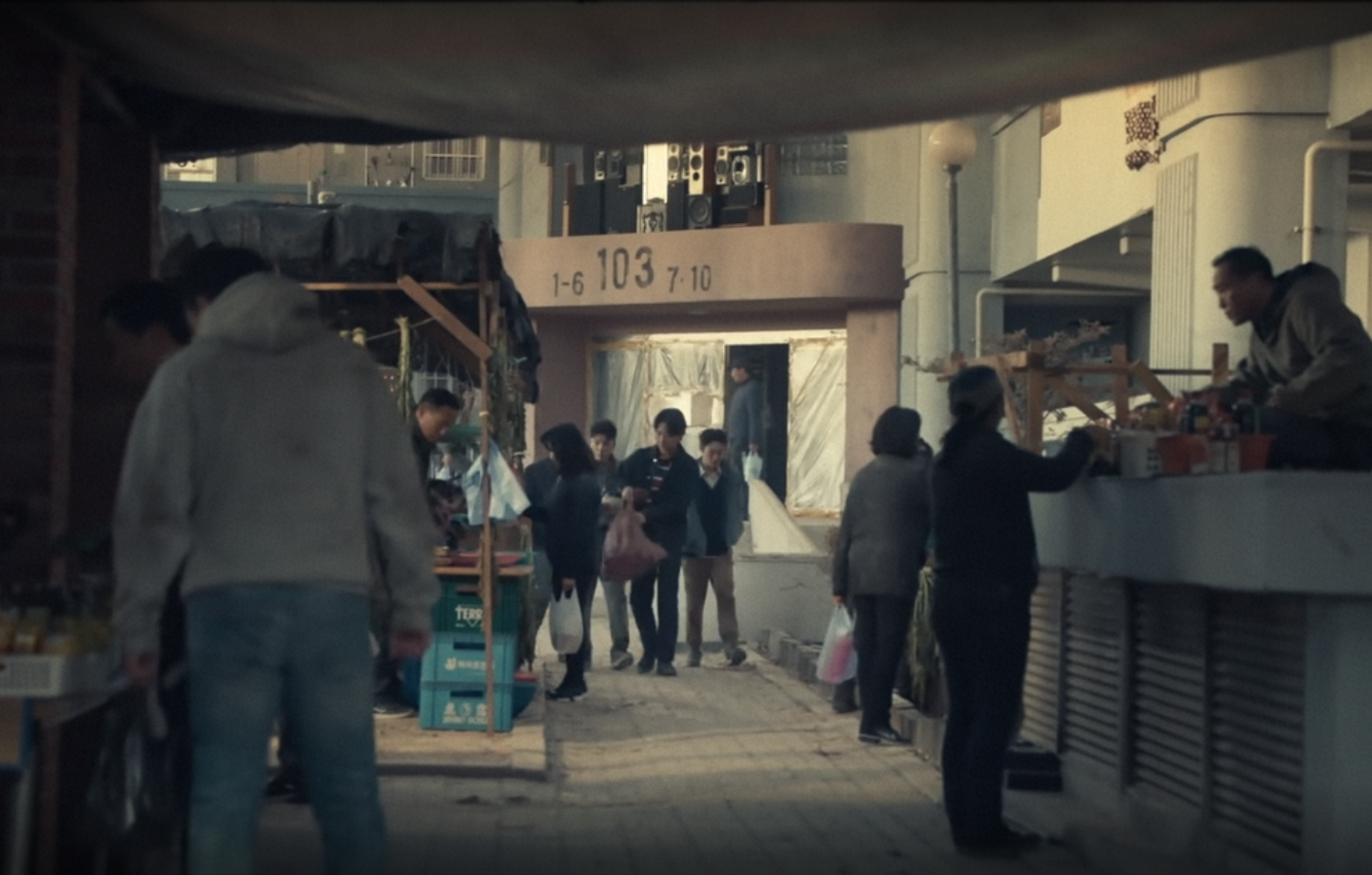 콘크리트 벽의 균열, 녹슨 파이프, 덕지덕지 붙은 생존의 흔적들 — 이 모든 디테일이 황궁마켓이라는 세계에 실제로 살아있는 역사를 부여한다. 관객은 이 공간에 들어서는 순간, 설명 없이도 이 세계의 규칙을 본능적으로 이해하게 된다. 그것이 진정한 미장센의 힘이다.